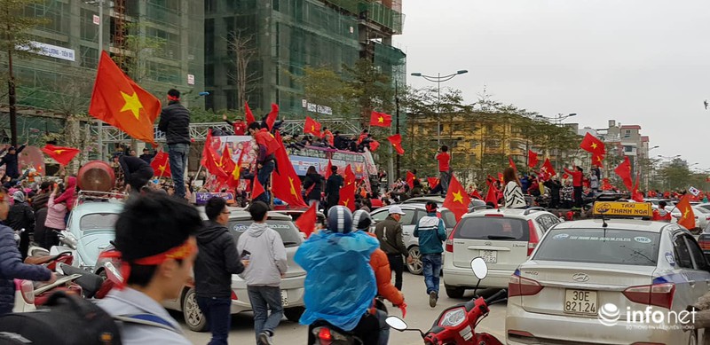 Rời sân bay Nội Bài đã 2 giờ đồng hồ, xe buýt chở đoàn U23 Việt Nam mới về đến đường Võ Chí Công, người dân phấn khích chạy bám theo đoàn xe buýt 2 tầng chở đoàn tuyển thủ U23 Việt Nam cùng ban huấn luyện, hô vang tên các cầu thủ và chụp ảnh.