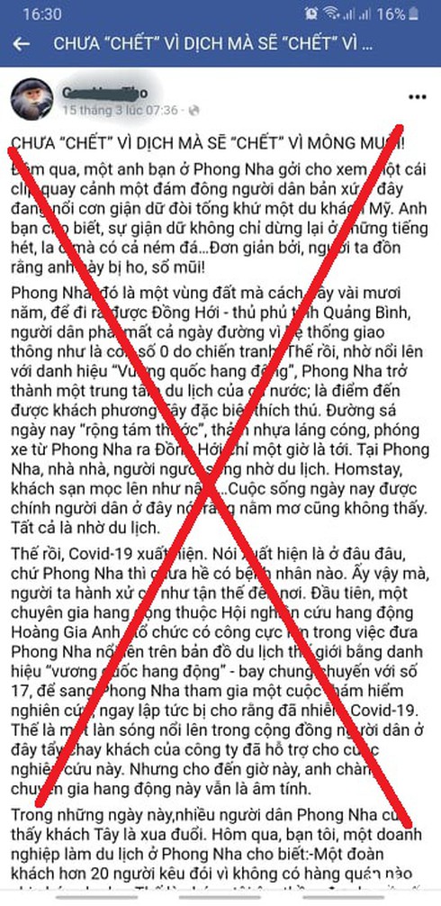 Tiếp đó, ngày 15/3, tài khoản facebook C.H.T có bài viết “chưa chết vì dịch, mà sẽ chết về “mông muội” với nội dung thể hiện người dân Phong Nha kỳ thị, hắt hủi du khách nước ngoài.