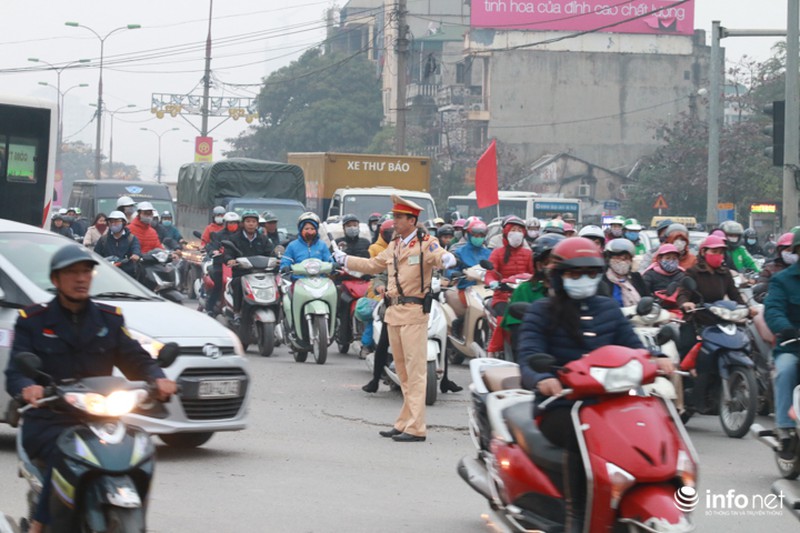 Các chiến sỹ CSGT túc trực thực hiện phân làn đường, đảm bảo giao thông thông suốt tại các cửa ngõ, các điểm nóng giao thông. |