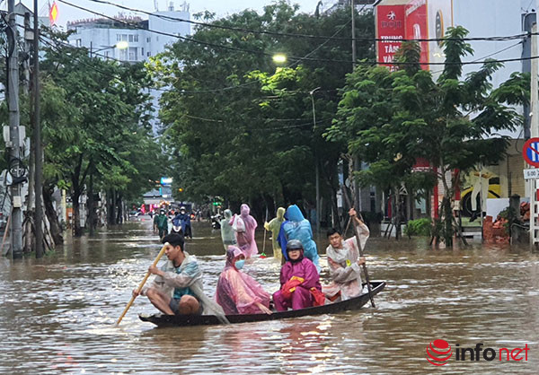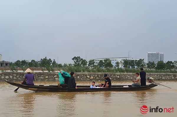 Tại các tuyến đường vẫn đang bị ngập lụt nặng có rất nhiều ghe đò hoạt động đón khách di chuyển trên đường.