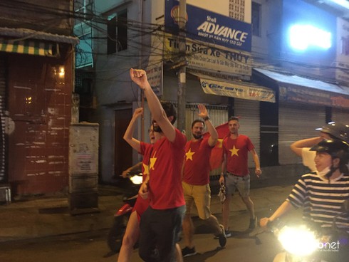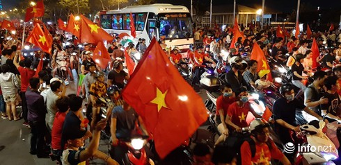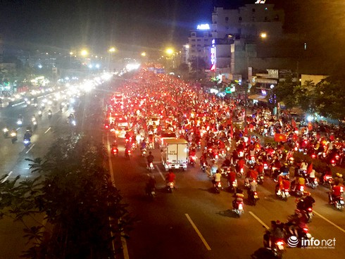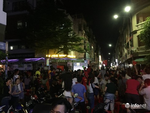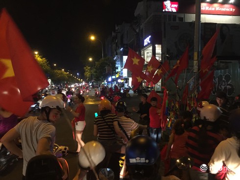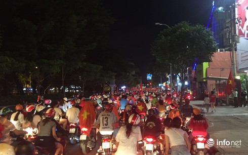Ngay sau khi tiếng còi mãn cuộc của trận đấu vang lên, hoà cùng không khí cuồng nhiệt cả nước, người dân TP.HCM cũng bắt đầu đổ ra đường ăn mừng chiến thắng. Được xem như là “chảo lửa” của Thành phố, phố đi bộ Nguyễn Huệ như "bầy ong vỡ tổ", hàng ngàn người hâm mộ ùn ùn tỏa ra các tuyến đường để “đi bão”.