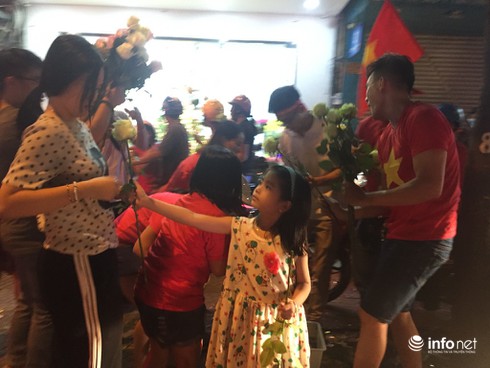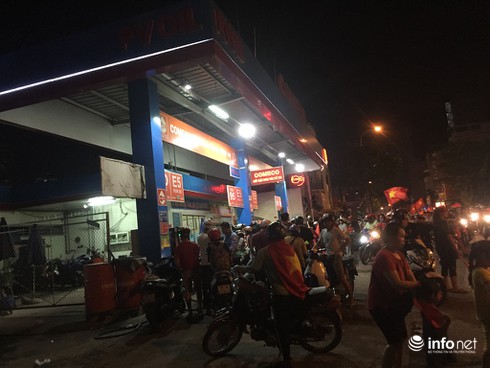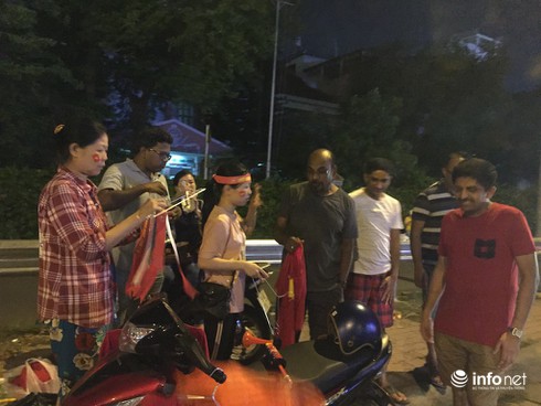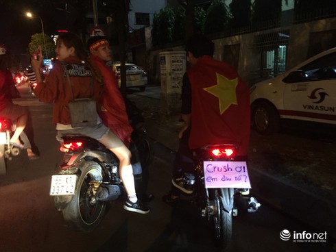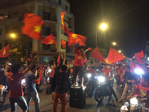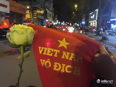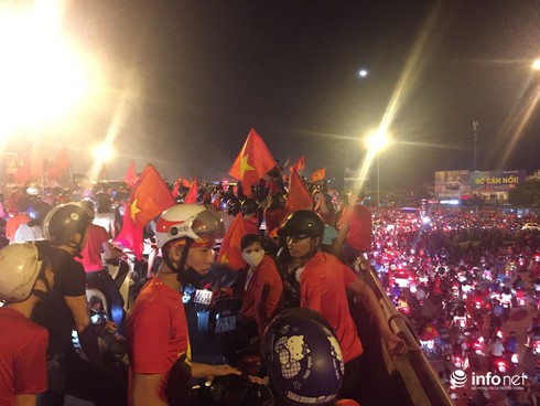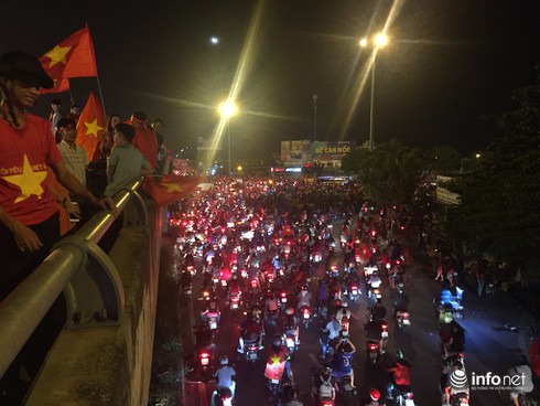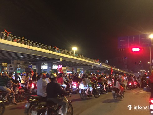 Các tuyến đường lân cận khu trung tâm xe cộ lưu thông đông đúc, về khuya không khí vẫn rất náo nhiệt. Từng nhóm người dân hai bên đường vẫy cờ, hò reo, hưởng ứng theo những tốp “đi bão” trên xe gắn máy chạy qua. Tất cả tạo nên một âm thanh vô cùng náo nhiệt.