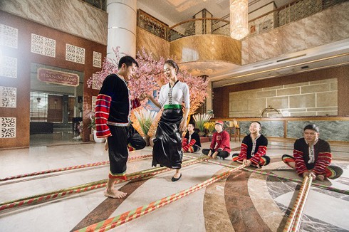 Ngọc Vân nhiệt tình tham gia vào các hoạt động đón tết tại khách sạn như mặc váy Thái, nhảy sạp, ném còn… Đây đều là những trò chơi truyền thống của người Tây Bắc được tái hiện ngay giữa không gian đại sảnh.