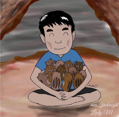Trên mạng xã hội Facebook những ngày qua đã lan truyền mạnh mẽ hình vẽ mô tả người trợ lý huấn luyện viên 25 tuổi Ekapol (anh đã đảm nhiệm vai trò HLV trong ngày HLV trưởng đi vắng) trong tư thế khoanh chân ngồi thiền và ôm 12 chú Heo Rừng (tên của đội bóng thiếu niên) trong lòng.