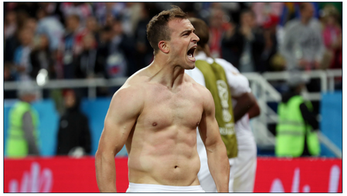 Shaqiri cởi phăng áo đấu khoe cơ bắp sau khi ấn định tỷ số 2-1 cho Thụy Sỹ. |