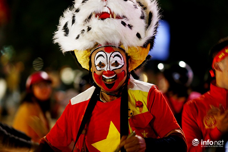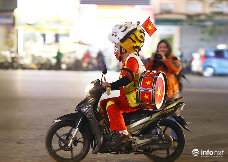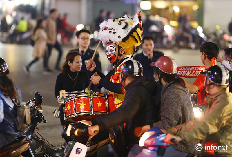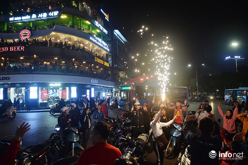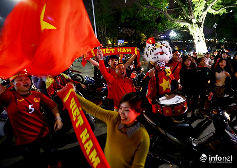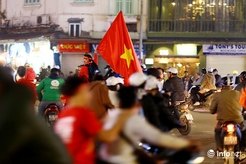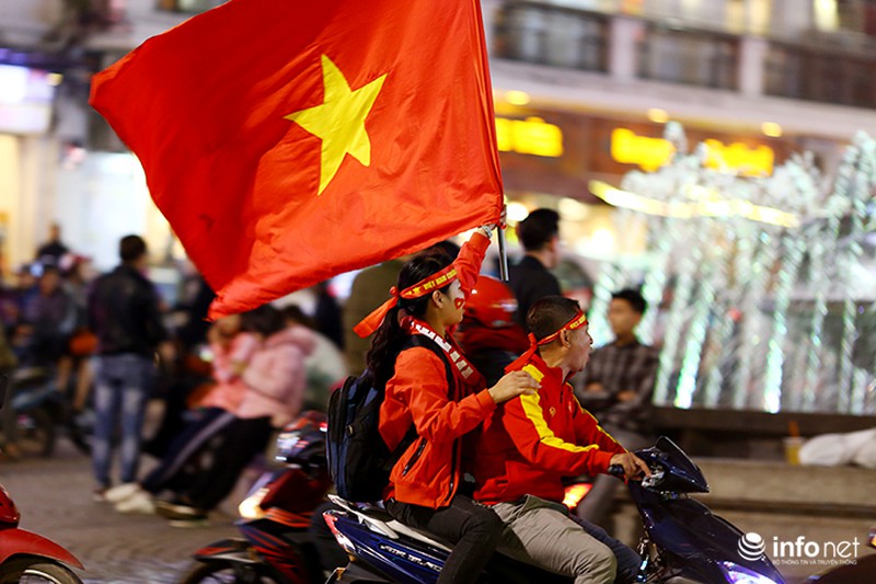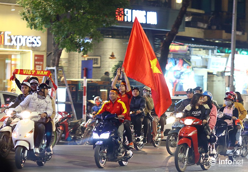 Sau thành công của đội nhà, nhiều CĐV ở Hà Nội đã mang cờ, hoa xuống đường ăn mừng. |