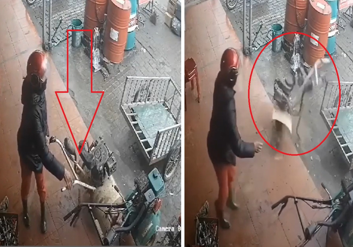 Theo clip, trước cửa hàng bán máy móc và vật tư thiết bị, một người phụ nữ tiến lại và lỡ tay khởi động chiếc máy đầm mini. Ngay sau đó chiếc máy trượt khỏi tầm kiểm soát của người phụ nữ rồi "nhảy múa" loạn xị ra đường, húc đổ cả chiếc xe máy đang dựng trên vỉa hè. Người phụ nữ cũng bị thương ở chân khi tìm cách dừng chiếc máy.