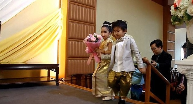Một cặp song sinh (8 tuổi) ở Thái Lan được gia đình tổ chức đám cưới hoành tráng với hy vọng “xua đuổi vận đen”.