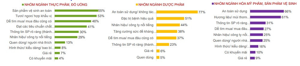 Cụ thể, đối với nhóm ngành thực phẩm, đồ uống, 55% người tiêu dùng lựa chọn yếu tố sản phẩm vệ sinh an toàn là hàng đầu; tương tự, nhóm ngành hóa mỹ phẩm, sản phẩm vệ sinh, yếu tố an toàn sử dụng cũng được 66% người tiêu dùng chọn.