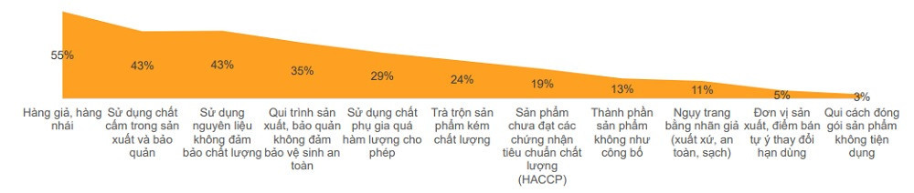 Những vụ việc liên quan đến thực phẩm không rõ nguồn gốc đang phần nào khiến người tiêu dùng lo lắng. Kết quả khảo sát cũng chỉ ra, 43% số người được khảo sát lo ngại doanh nghiệp sử dụng chất cấm trong sản xuất và bảo quản, hay sử dụng nguyên liệu không đảm bảo chất lượng để sản xuất; cũng có khoảng 1/3 người tiêu dùng được khảo sát lo ngại quy trình sản xuất không đảm bảo vệ sinh an toàn hoặc sử dụng chất phụ gia quá hàm lượng cho phép. Đáng chú ý, nỗi lo về hàng giả, hàng nhái chiếm vị trí số 1.