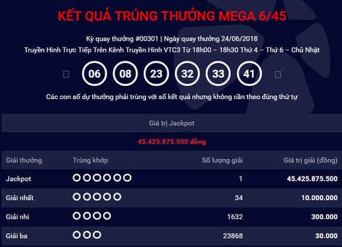 Tại kỳ quay số kết thúc ngày 24/6, Vietlott xác định được có 1 vé trúng giải độc đắc. Bộ số trúng giải là 06-08-23-33-41, với giá trị giải thưởng lên đến 45,4 tỷ đồng.