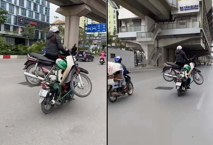 Theo clip đang gây xôn xao mạng xã hội, trên tuyến đường Trần Phú, quận Hà Đông, TP Hà Nội có nhiều người và phương tiện qua lại, một nam tài xế xe máy đã chở theo phía sau hẳn 1 chiếc xe máy và 1 người ngồi trên xe này. Người phụ nữ ngồi vắt vẻo trên xe không màng tới nguy cơ tai nạn có thể xảy đến trong tích tắc.