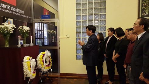 Mở đầu Lễ viếng, Đại sứ Lê Huy Hoàng nêu bật những công lao to lớn của nguyên Tổng Bí thư Đỗ Mười, nhấn mạnh nguyên Tổng Bí thư Đỗ Mười trên nhiều cương vị công tác trong suốt cuộc đời hoạt động cách mạng, dù trong lao tù của thực dân đế quốc hay ngoài chiến trận, dù trong thời kỳ kháng chiến kiến quốc gian khổ hay trong giai đoạn xây dựng và bảo vệ tổ quốc, luôn giữ vững khí tiết, phẩm chất của người cộng sản, luôn hoàn thành xuất sắc trọng trách trước Đảng, Nhà nước và nhân dân. Đồng chí nguyên Tổng Bí thư đã có nhiều đóng góp quan trọng cho sự nghiệp cách mạng phát triển đất nước ta, trong đó có vai trò trực tiếp lãnh đạo xúc tiến xây dựng Nhà nước pháp quyền xã hội chủ nghĩa, thúc đẩy quá trình cải cách đổi mới kinh tế ở Việt Nam, mở đường cho sự nghiệp phát triển mạnh mẽ thành công của đất nước ta trong nhiều năm qua. Nguyên Tổng Bí thư Đỗ Mười cũng rất quan tâm chỉ đạo sát sao các hoạt động đối ngoại của Đảng và Nhà nước, góp phần quan trọng mở rộng quan hệ của nước ta với nhiều quốc gia, nhiều tổ chức đối tác quan trọng trong và ngoài khu vực.