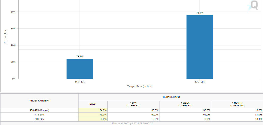 Theo công cụ FedWatch của CME Group, khoảng 76% dự báo khả năng Fed sẽ nâng lãi suất thêm 25 điểm cơ bản, 24% còn lại dự báo không.