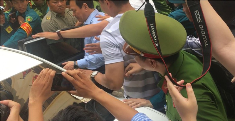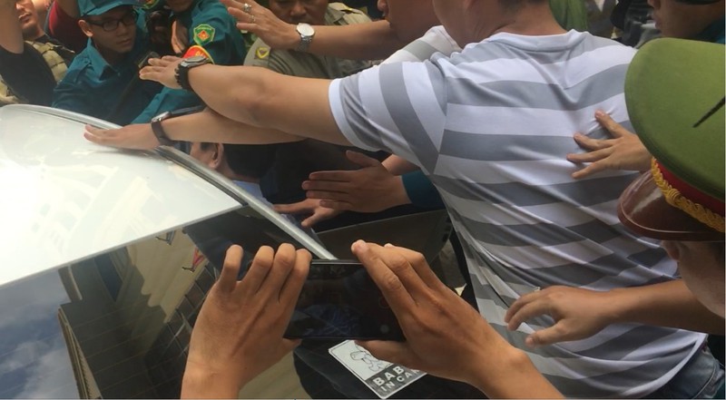 Lực lượng bảo vệ, hỗ trợ phiên tòa phải rất vất vả dẹp đường chiếc xe mới rời đi được.