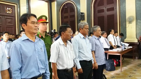 Ông Đặng Thanh Bình (ngoài cùng bên phải) và các bị cáo trong vụ án. |