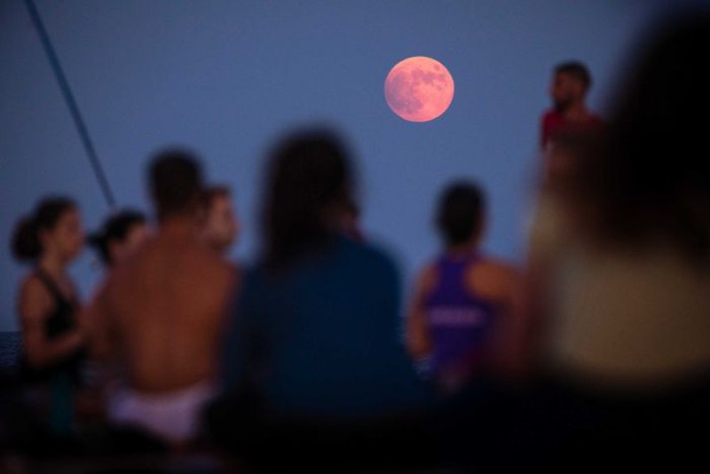 Một lớp yoga theo dõi nguyệt thực một phần trên Địa Trung Hải ở Barcelona, Tây Ban Nha. |