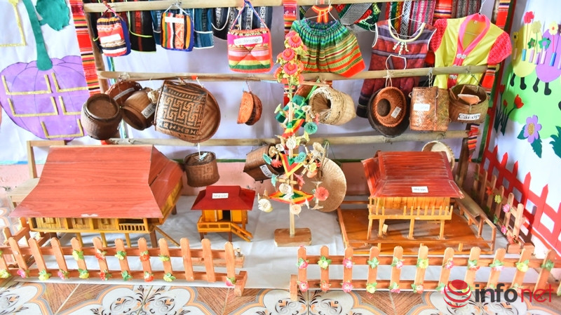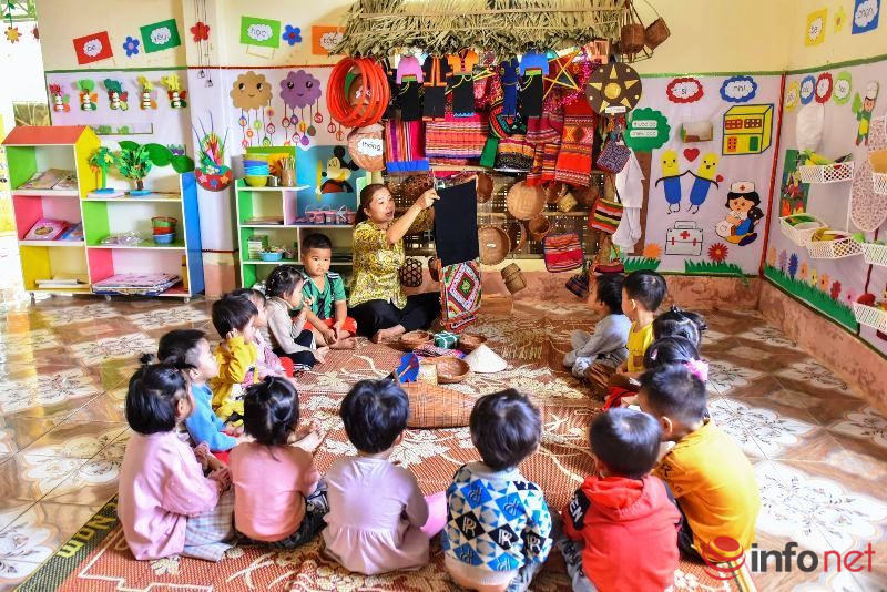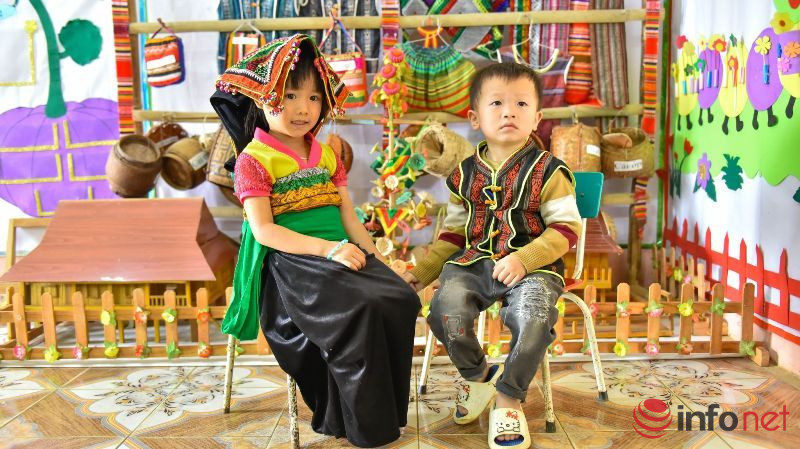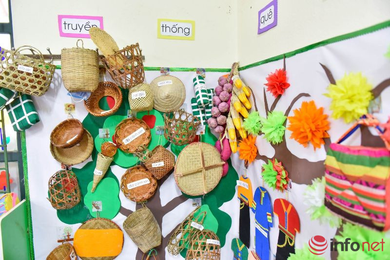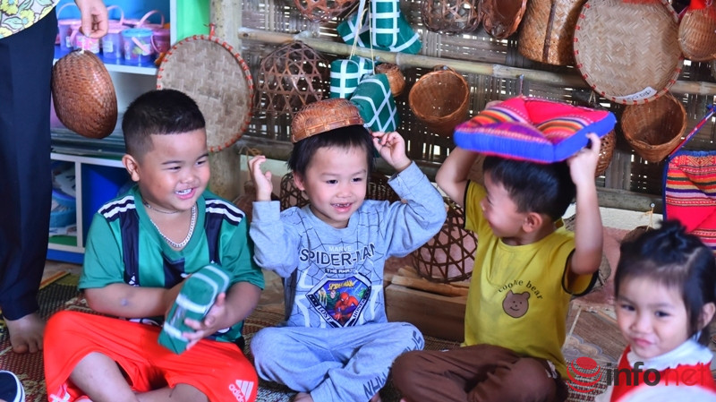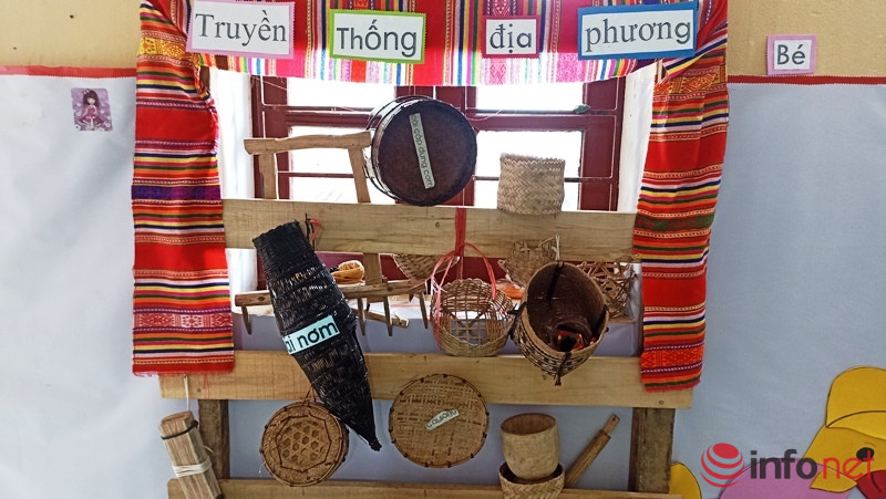 Khi tới thăm trường mầm non này, chúng tôi không khỏi ngạc nhiên khi rất nhiều đồ dùng học tập của học sinh được các thầy cô giáo sáng tạo từ những vật dụng có sẵn tại địa phương. Đặc biệt, nơi đây còn có hẳn một góc học tập truyền thống thể hiện sắc màu văn hóa của người dân tộc Thái, Mường.