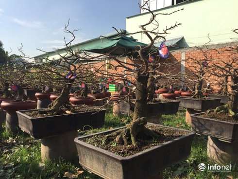 Các chậu mai bán và cho thuê đã được phân loại, niêm yết giá. |