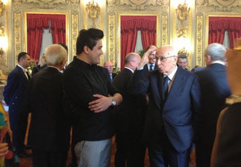 | Tổng thống Ý chúc mừng nghệ sĩ Bùi Công Duy sau khi xem anh trình tấu bài Concerto của Beethoven với dàn nhạc giao hưởng Việt Nam |