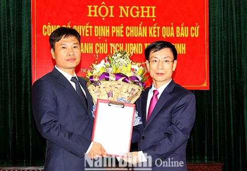Chủ tịch UBND tỉnh Nam Định Phạm Đình Nghị vừa trao Quyết định số 2448/QĐ - UBND của UBND tỉnh về việc phê chuẩn đồng chí Hoàng Nguyên Dự, Phó Bí thư Thành ủy Nam Định nhiệm kỳ 2015 - 2020 giữ chức vụ Chủ tịch UBND thành phố Nam Định, nhiệm kỳ 2016 - 2021. Trước đó, tại phiên họp bất thường ngày 1/11/2018, HĐND thành phố Nam Định đã bầu đồng chí Hoàng Nguyên Dự làm Chủ tịch UBND thành phố Nam Định nhiệm kỳ 2016 - 2021 với 100% số phiếu tán thành./.