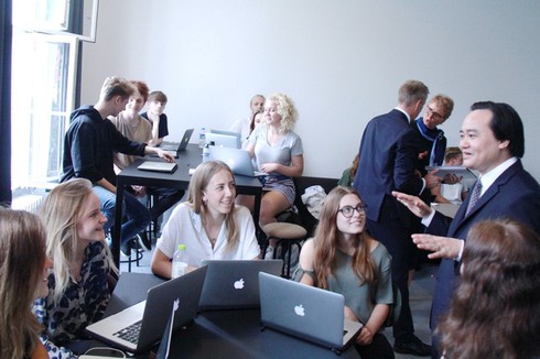 Bộ trưởng Phùng Xuân Nhạ trò chuyện với sinh viên nước ngoài nhân chuyến thăm Phần Lan, Thụy Điển và Đan Mạch (ảnh: Đào Ngọc Tước) |