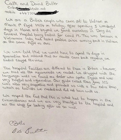Kết thúc thời hạn cách ly, để bày tỏ sự cảm kích với các bác sĩ, ông bà Butler đã để lại một lá thư.
