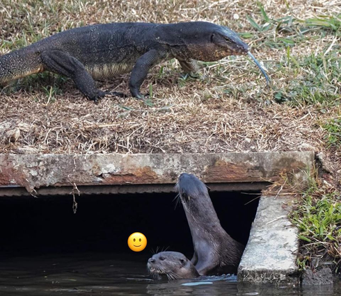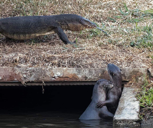 Minh chứng là trong những hình ảnh dưới đây, một cặp đôi rái cá đang mải ôm ấp nhau thì bỗng nhiên một chú kỳ đà đi ngang rồi...đứng lại nhìn chằm chằm làm đôi rái cá ngượng ngùng lặn mất.