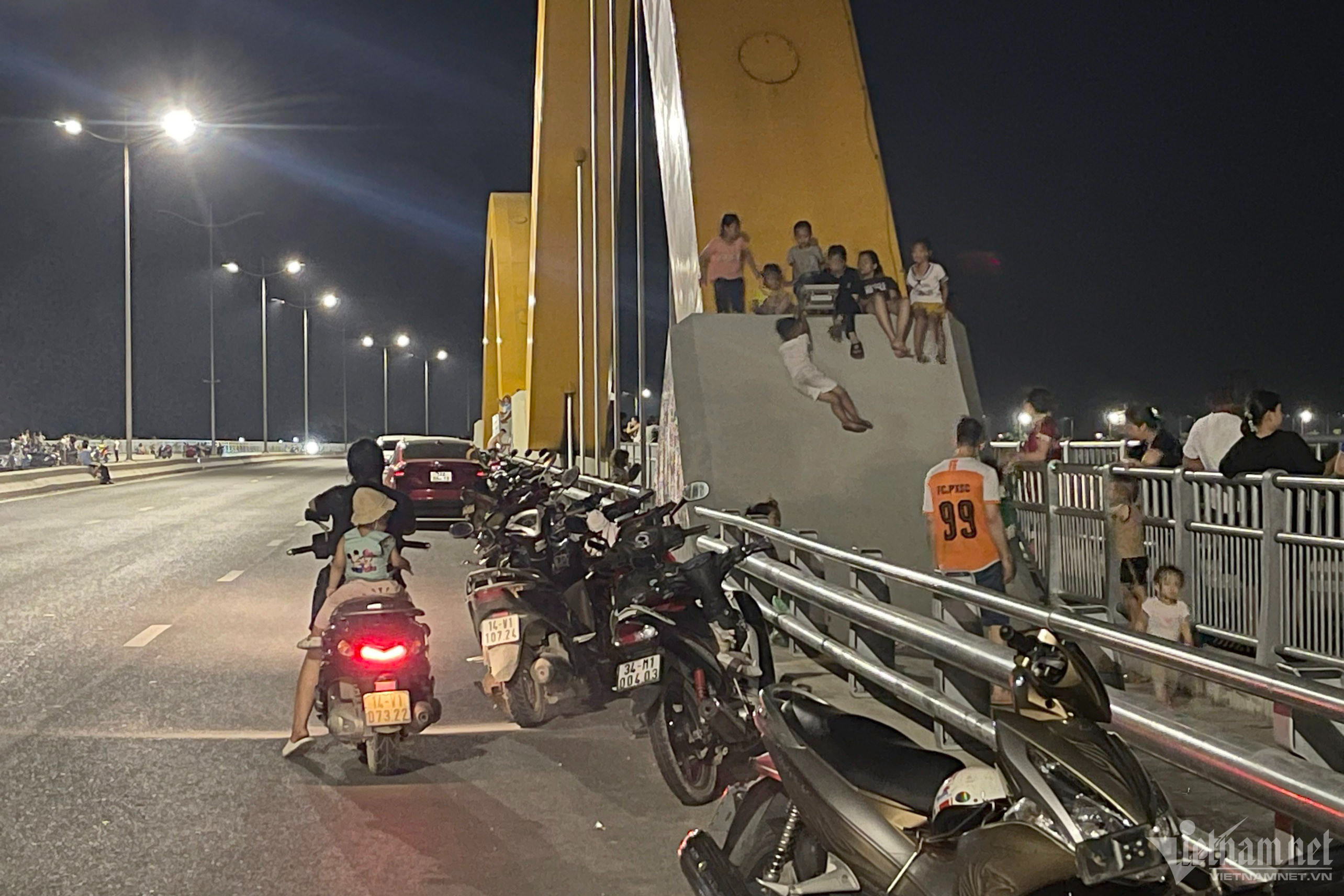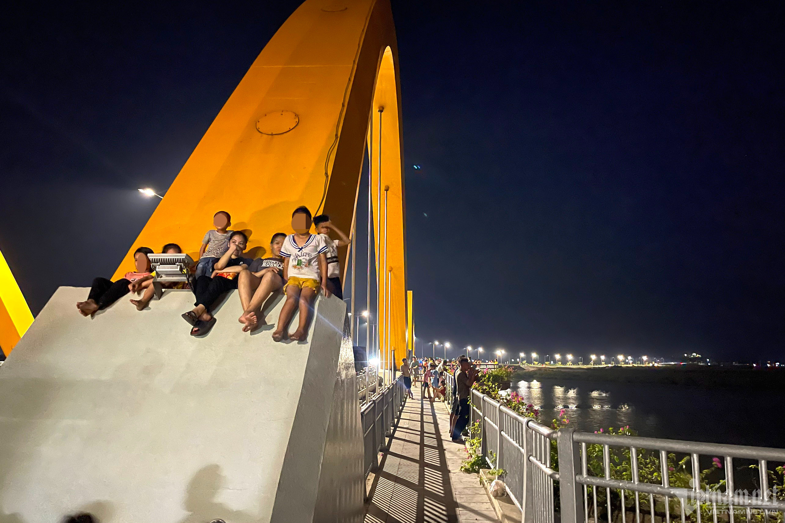 Mỗi điểm trụ cầu đều có nhiều người trèo lên ngồi, thậm trí dải phân cách giữa cầu được người dân chọn ngồi hóng mát tiềm ẩn mất an toàn giao thông.