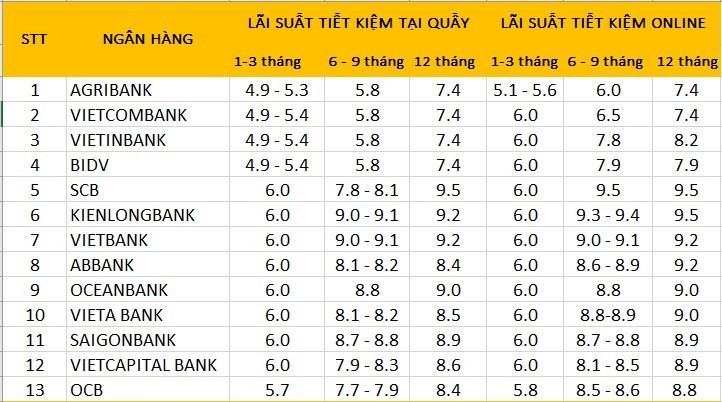 Một số ngân hàng không có sự chênh lệch giữa lãi suất huy động tại quầy và online như VietBank, Saigonbank, OceanBank, Techcombank,...