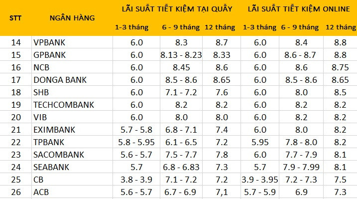 Một số ngân hàng khác như VietCapital Bank, BacA Bank, OCB, DongA Bank cũng có lãi suất huy động từ 9-9,5%/năm cho các kỳ hạn trên 12 tháng.