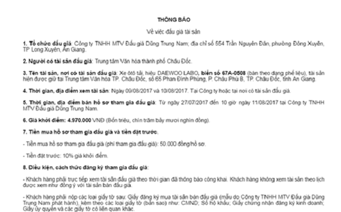 Trung tâm Văn hóa thành phố Châu Đốc (tỉnh An Giang) thông báo bán đấu giá xe ô tô tải theo dạng phế liệu với mức giá chỉ 4,97 triệu đồng |