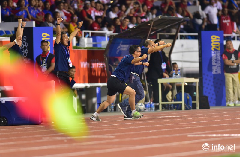 Để rồi, đến phút thứ 39, Văn Hậu đã có pha đánh đầu mở tỉ số trận đấu. Niềm phấn khích đang trào, ông Park đã chạy như bay ra đường biên ăn mừng cùng các học trò của mình. |