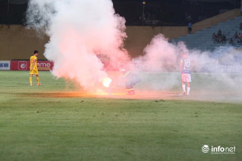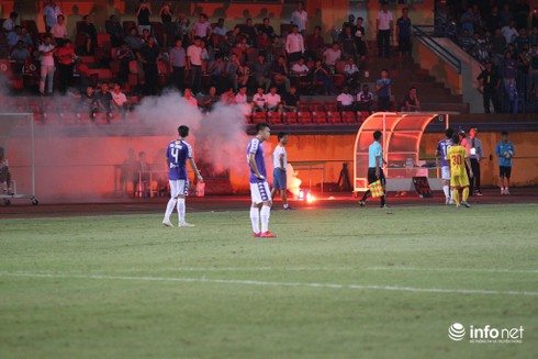 Đến phút 22, Nam Định có bàn thắng cân bằng thế trận, pháo sáng lại được ném tới tấp xuống đường piste, thậm chí còn bị khán giả quá khích cố tình ném vào chỗ đứng của cầu thủ dự bị Hà Nội ở sát đường biên ngang.