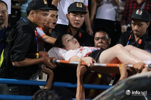 Nữ CĐV rách lớn ở chân, máu chảy nhiều, các bác sĩ ngay lập tức băng bó rồi đưa đi cấp cứu. |