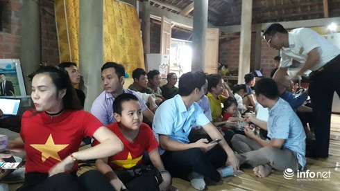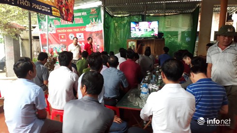 Người dân ngồi trong nhà của thủ môn Tiến Dũng theo dõi trận đấu |
