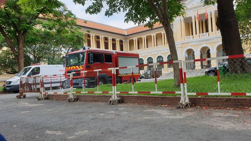 An ninh quanh tòa án được thắt chặt. Lực lượng cảnh sát cơ động cùng xe cứu hỏa, cứu thương chờ sẵn. |