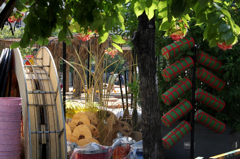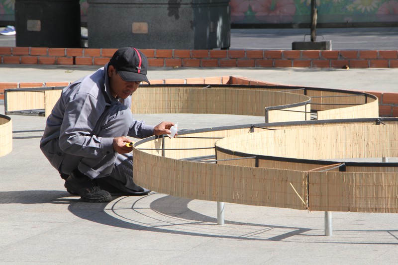 Đến thời điểm này nhiều nguyên vật liệu phục vụ cho việc lắp đặt các tiểu cảnh tại đường hoa đã được vận chuyển vào đây. Đa phần các mô hình đã được hoàn thiện từng phần từ trước tại các khu vực ngoại thành, giờ đây công nhân chỉ cần ghép lại theo đúng thiết kế. |