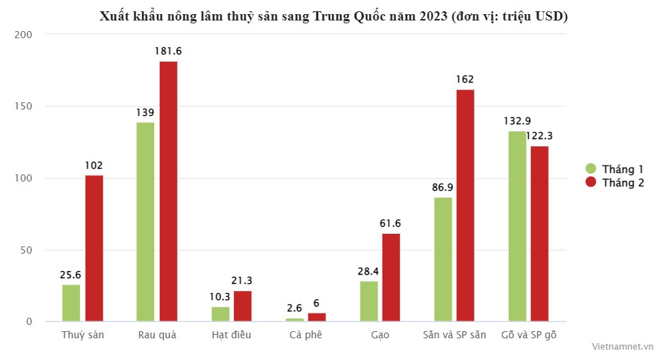 Thống kê sơ bộ từ Tổng cục Hải quan cho thấy, xuất khẩu nông lâm thủy sản sang Trung Quốc 2 tháng đầu năm nay đạt 1,27 tỷ USD, đưa Trung Quốc thành khách hàng lớn nhất trong hai tháng đầu năm, chiếm 20,2% tổng giá trị xuất khẩu nông sản của Việt Nam.