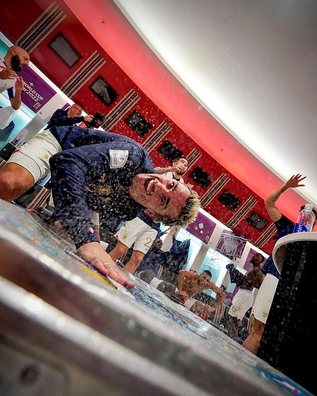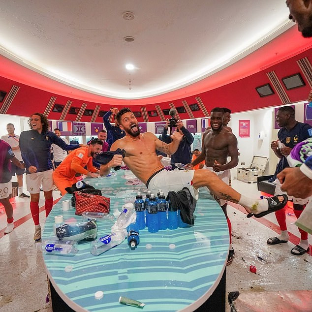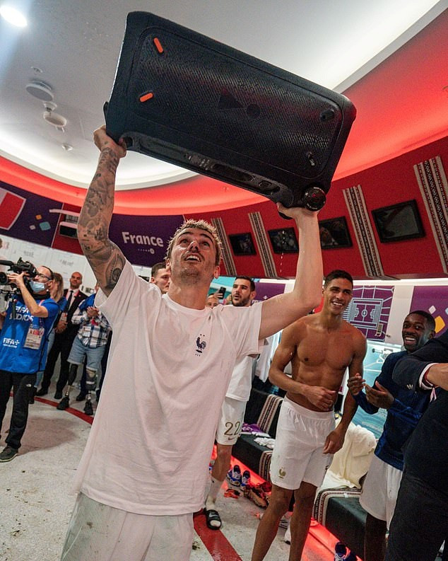 Tiền đạo kỳ cựu Olivier Giroud thậm chí còn cởi bỏ quần áo để trượt quanh phòng thay đồ, kể cả trên chiếc bàn lớn ở giữa, trong khi Antoine Griezmann chộp lấy chiếc loa và đi loanh quanh giơ cao quá đầu.