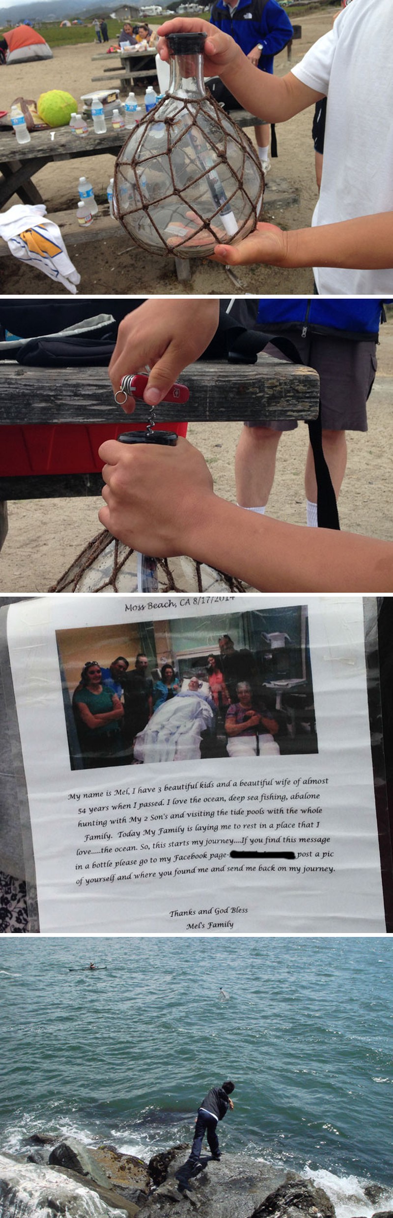 Một người đàn ông đã tìm thấy cái chai thủy tinh trên biển. Trong đó có một bức thư do ai đó thả trôi ở đại dương. Thư viết: "Tên tôi là Mel, tôi có 3 đứa con xinh xắn và một người vợ tuyệt vời trong suốt 54 năm cuộc đời. Tôi rất yêu đại dương, những chuyến câu cá ở vùng biển sâu và những cuộc săn bào ngư hào hứng cùng với 2 đứa con trai. Tôi còn thích đến thăm các hồ thủy triều cùng với cả nhà. Hôm nay, gia đình đã giúp tôi yên nghỉ tại nơi đại dương mà tôi yêu quý. Vì vậy, tôi bắt đầu cuộc hành trình của mình, nếu ai đó tìm thấy lá thư này hãy truy cập vào trang Facebook của gia đình tôi và chia sẻ một tấm ảnh của bạn cùng nơi mà bạn đã tìm thấy tôi. Sau đó hãy trả tôi về đại dương để tôi tiếp tục chuyến đi của mình." |