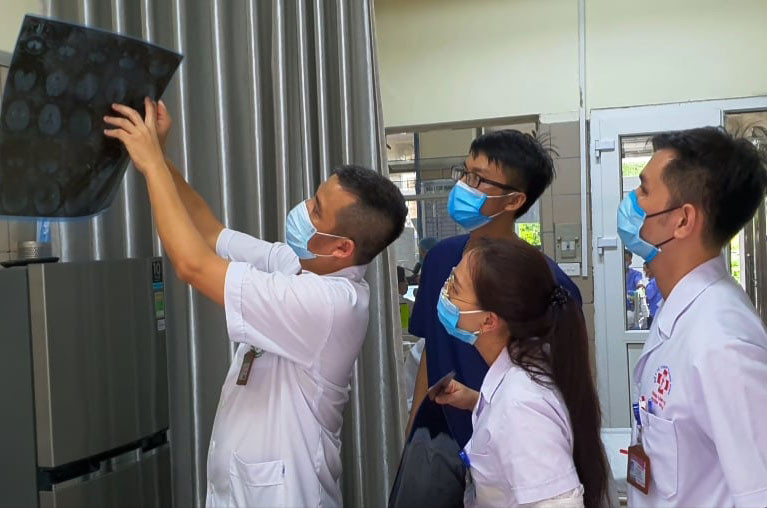 Bác sĩ Nguyễn Trung Nguyên kiểm tra phim chụp của bệnh nhân ngộ độc rượu methanol bị tổn thương não. Ảnh: Mai Thanh