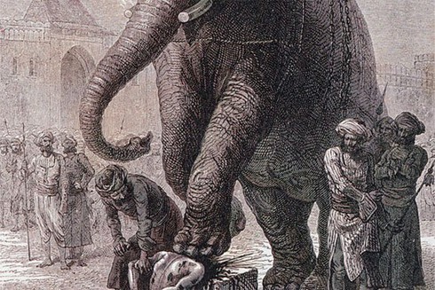 Tuy nhiên đôi khi động vật cũng có phần đóng góp trong việc nghiền nát con người. Những loài động vật to lớn như voi chẳng hạn, ở cuối thế kỷ 19 chúng vẫn được dùng làm phương tiện để nghiền nát con người (nô lệ, tù nhân). Đầu tiên các tên tội phạm sẽ bị trói vào chân con voi và đưa đi khắp phố diễu. Cuối cùng họ sẽ quỳ xuống, đặt đầu lên một hòn đá và con voi sẽ thực thi công lý bằng chân của mình.