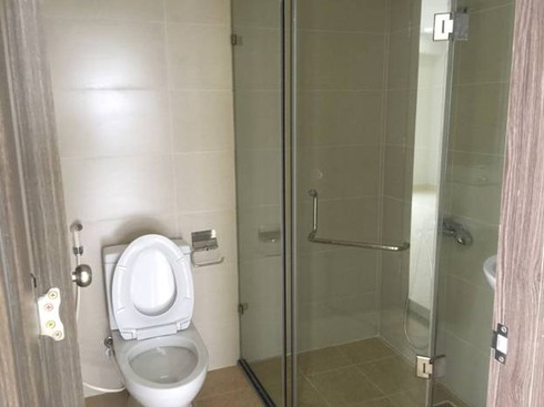 Bàn giao nhà vệ sinh gồm vách tắm kính đứng cường lực, vòi hoa sen, thiết bị vệ sinh đầy đủ. |