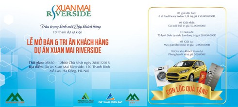 Đây là chương trình ưu đãi hấp dẫn nhất của Công ty CP Đầu tư và Xây dựng Xuân Mai ( Xuân Mai Corp.) thực hiện nhằm tri ân các khách hàng mua nhà dự án Xuân Mai Riverside. Theo đó, Xuân Mai Corp. dành quà tặng đặc biệt là 1 xe ôtô Ford Fiesta trị giá 450 triệu đồng, 1 gói nội thất mừng tân gia nhà mới 50 triệu đồng, tủ lạnh side by side 20 triệu đồng, máy giặt Electrolux 10 triệu đồng và nhiều quà tặng cho các khách hàng đến tham dự mở bán. Các khách hàng đặt cọc mua nhà dự án trước 28/1/2018 sẽ được tham gia bốc thăm trúng thưởng tại sự kiện Tri ân khách hàng và mở bán lớn được tổ chức vào 9h00 sáng ngày 28/1/2018 tại Văn phòng bán hàng, Dự án Xuân Mai Riverside, Thanh Bình, Hà Đông, Hà Nội.
