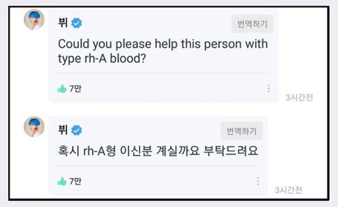 Nam thần tượng đình đám đã đăng tải một bài viết lên WeVerse kêu gọi người hâm mộ hãy chú ý phòng dịch bệnh viêm phổi corona và giữ gìn sức khỏe thật tốt. V cũng khuyến khích mọi người hãy nhớ là thường xuyên thực hiện các phương pháp phòng ngừa cần thiết. Trước đó không lâu nam idol cũng đã từng khiến các fan tự hào khi lên tiếng kêu gọi, giúp đỡ một Army (tên fandom của BTS) tìm được người hiến máu có nhóm máu hiếm Rh-A để cứu ông của mình. Cụ thể bài đăng của cô ấy như sau: "Mình xin lỗi vì đã gửi tin nhắn cá nhân trên WeVerse. Xin hãy giúp đỡ. Nếu mọi người là người có nhóm máu Rh-A, vui lòng liên hệ với mình. Mình sẽ liên lạc với mọi người". Không lâu sau đó, V đã để lại bình luận bên dưới bài viết bằng cả tiếng Anh lẫn tiếng Hàn với nội dung: "Mọi người có thể vui lòng giúp đỡ bạn nếu có nhóm máu Rh-A không?".