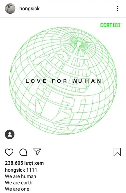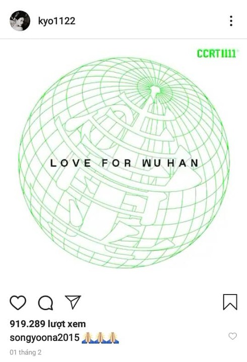 Ngày 01/02 vừa qua, nữ diễn viên đình đám đã chia sẻ một đoạn video trên tài khoản cá nhân Instagram với thông điệp "Love for human - Love for Wuhan" (tạm dịch: Tình yêu dành cho nhân loại - Tình yêu dành cho Vũ Hán). Vũ Hán vốn được biết đến như "trung tâm" của dịch corona. Các ban ngành y tế, các y bác sĩ và tất cả người dân nơi đây đều đang ngày đêm chiến đấu kiên cường nhằm đẩy lùi dịch bệnh. Vì thế, thông điệp ngắn gọn nhưng đầy ý nghĩa này đã khiến nhiều người xúc động: rằng người dân Vũ Hán, người dân Trung Quốc hay tất cả những ai đang chiến đấu với đại dịch này - tất cả đều không cô đơn. Mọi người đều ở đây, sẵn sàng ủng hộ, tiếp sức và cùng nhau vượt qua thời điểm khó khăn hiện tại. Nam diễn viên Yoo Ah In - đồng nghiệp thân thiết của Song Hye Kyo sau đó cũng đã chia sẻ lại đoạn clip này cùng lời nhắn: "We are human. We are earth. We are one" (tạm dịch: Chúng ta là con người. Chúng ta là Trái Đất. Và chúng ta là một) trên Instagram cá nhân.