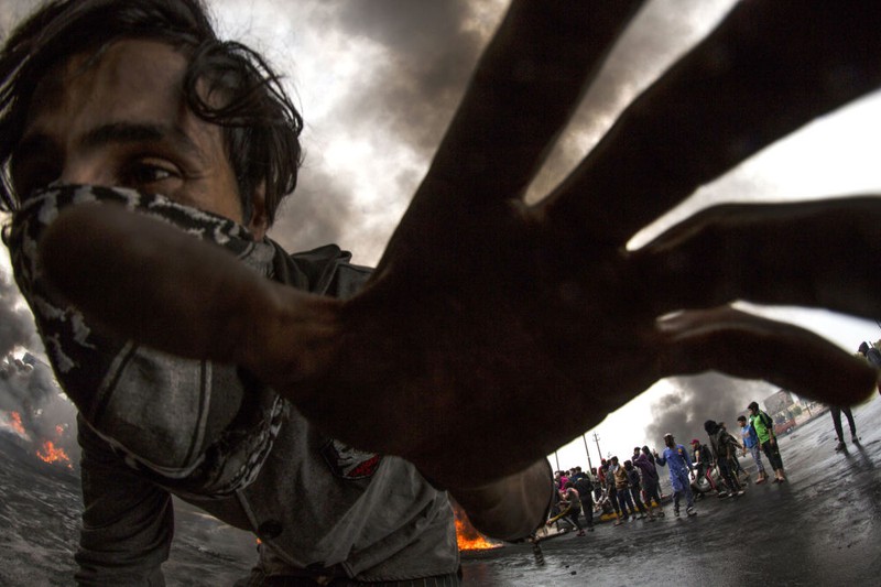 Một người biểu tình Iraq bỏ chạy khi những người khác đốt bánh xe để chặn đường ở thành phố Basra hôm 25/11. |