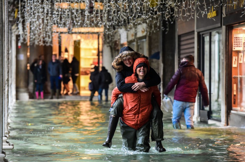 Du khách thích thú cõng nhau qua những con phố ngập nước do hiện tượng thủy triều ở Venice. |