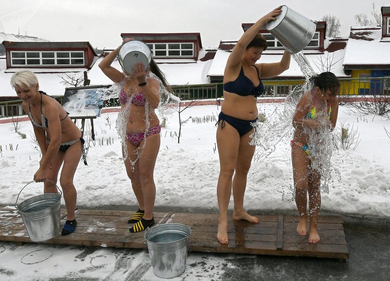 Các thành viên câu lạc bộ huấn luyện Gấu Bắc Cực đổ nước đóng băng lên người, một phần trong lễ hội nhân ngày Gấu Bắc Cực quốc tế ở Krasnoyarsk, Nga. |